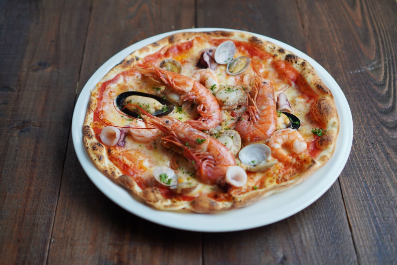 海の幸のトマトソースピッツァ B コメント シェフ厳選魚介類をガーリックと白ワインで蒸してトッピングした具だくさんのピッツァ。 具材:有頭海老、ベビー帆立、あさり、ムール貝、イカ、魚又は牡蠣など季節の魚介 生地:パリパリ薄生地 金額 ¥2,500(税込み)